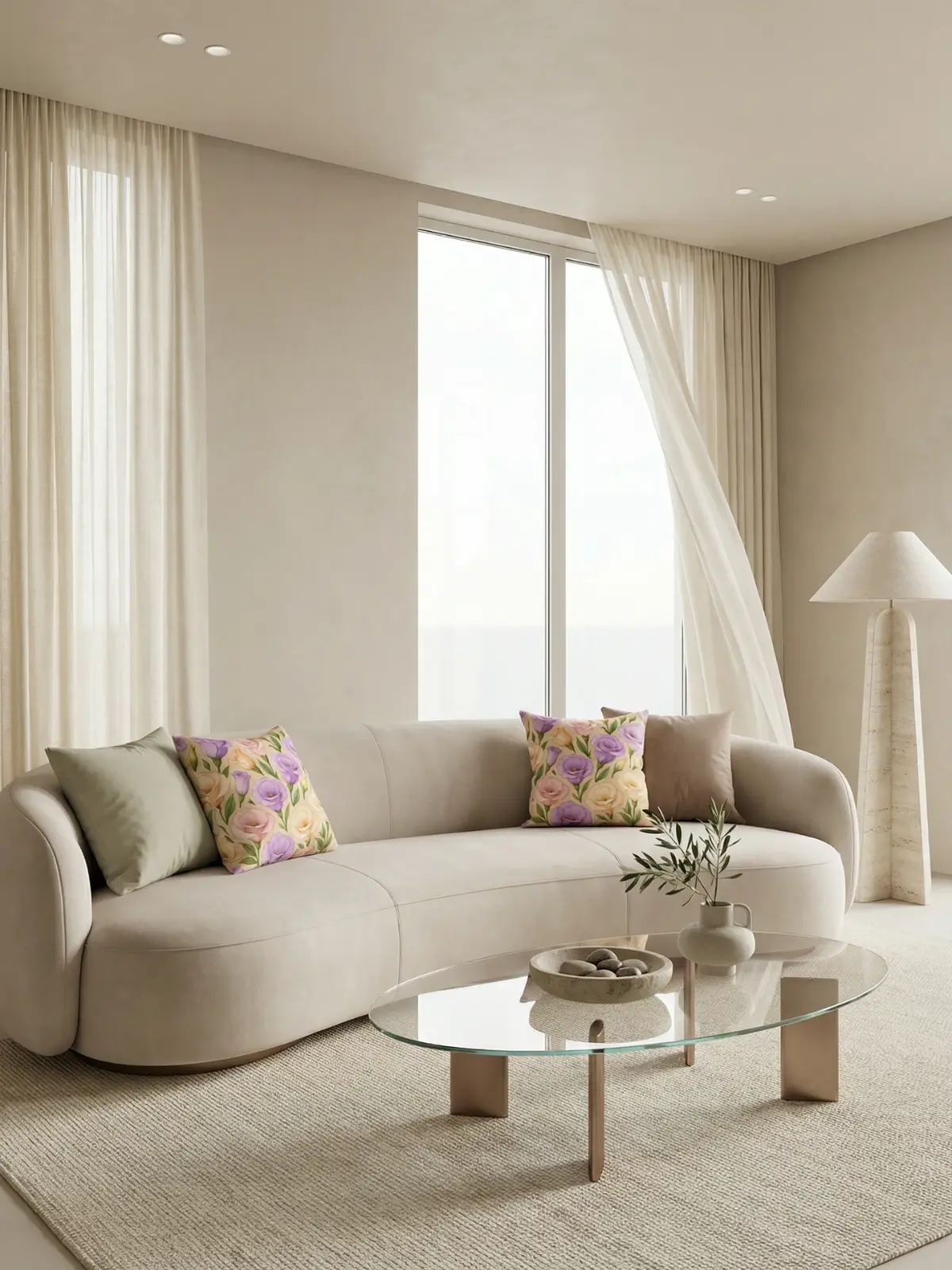 An airy modern living room featuring warm ivory linen sheer curtains, a pearl-beige curved sofa, and two identical floral-throw-pillow-eustoma-floral-beige accents styled unmodified. Soft lighting and glass furniture create an editorial, serene atmosphere.