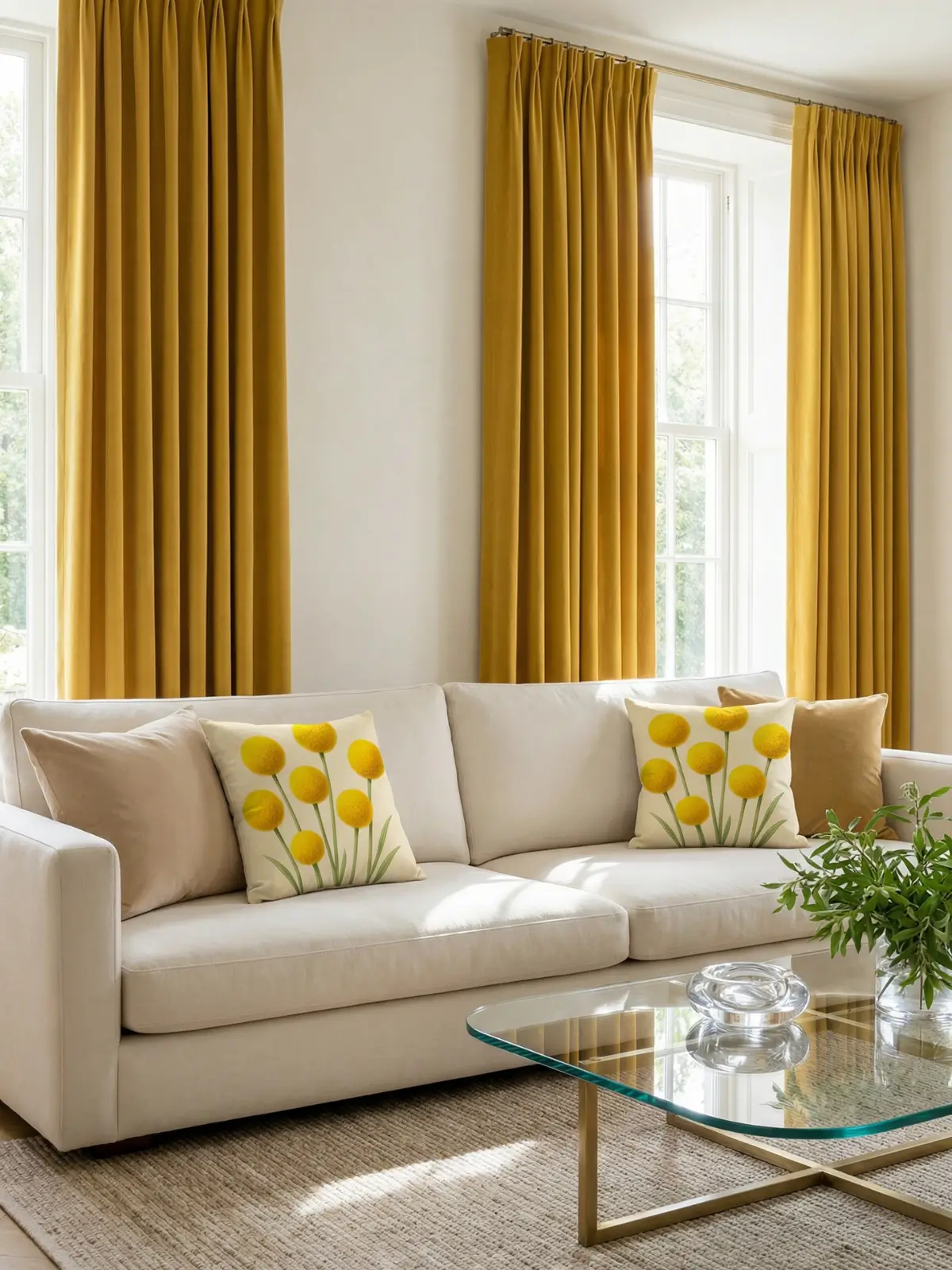 Color Harmony: Mustard yellow curtains echo the golden tones of the billy buttons watercolor pillow, while off-white upholstery keeps the palette fresh and bright. Sand and ochre accents add warmth, and glass elements maintain lightness for a confident modern luxury balance.