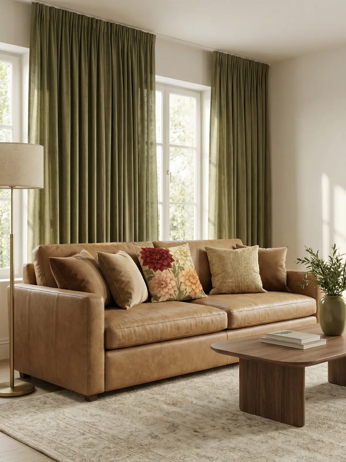 Olive Green Curtains with Dahlia Vintage Luxury Pillow on Camel Leather Sofa
