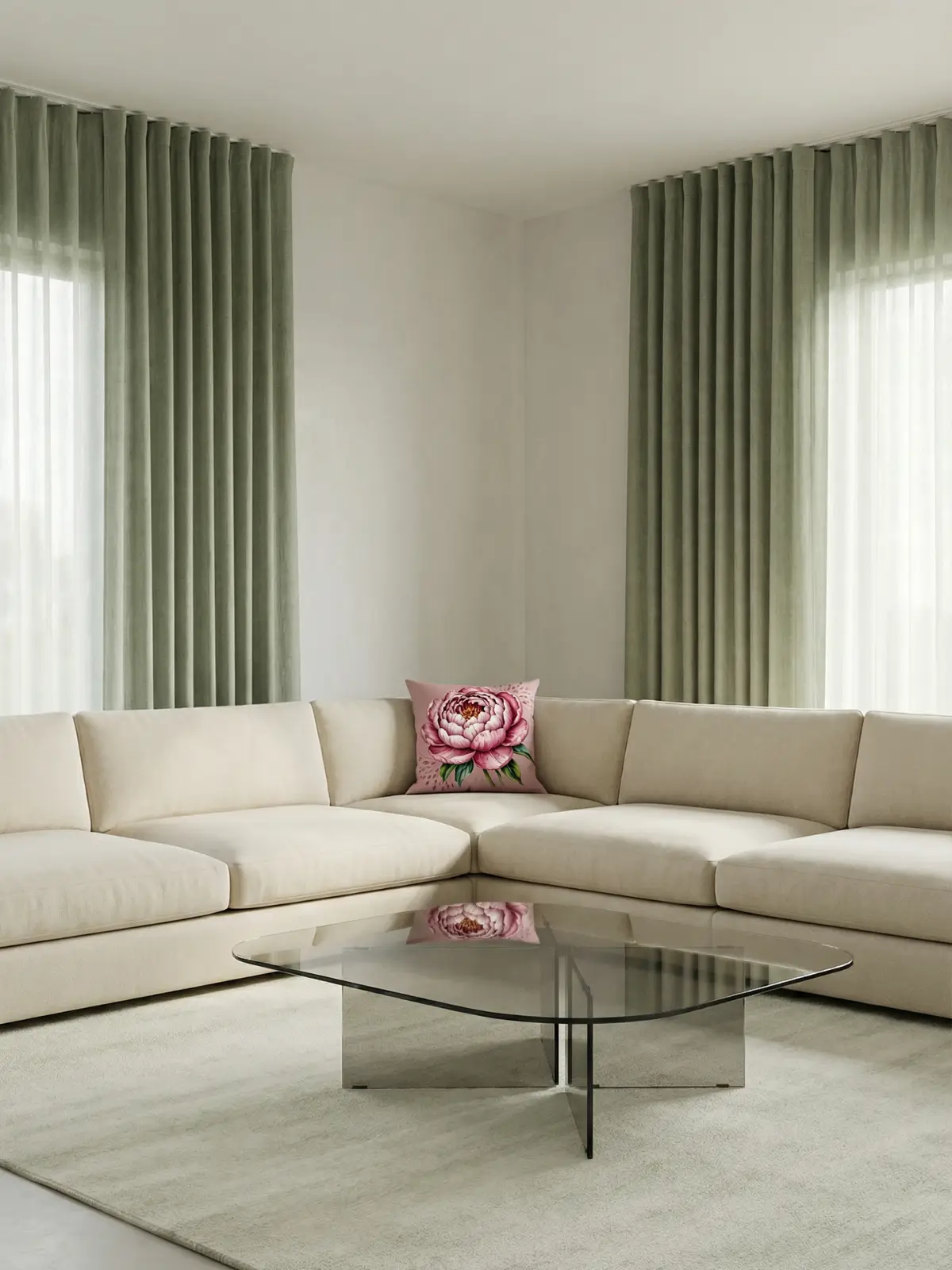 A luxury editorial living room featuring sage green curtains and the Blush Peony Bloom Pillow styled on a full-scale ivory L-shaped sectional sofa. Designed with architectural balance, modern glass furniture, and refined lighting for a contemporary high-end aesthetic.